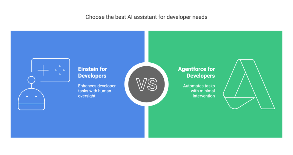 Salesforce offers two AI-driven tools tailored for developers: Einstein for Developers and Agentforce for Developers. While both aim to enhance the development experience within the Salesforce ecosystem, they differ in functionality, autonomy, and data processing capabilities.